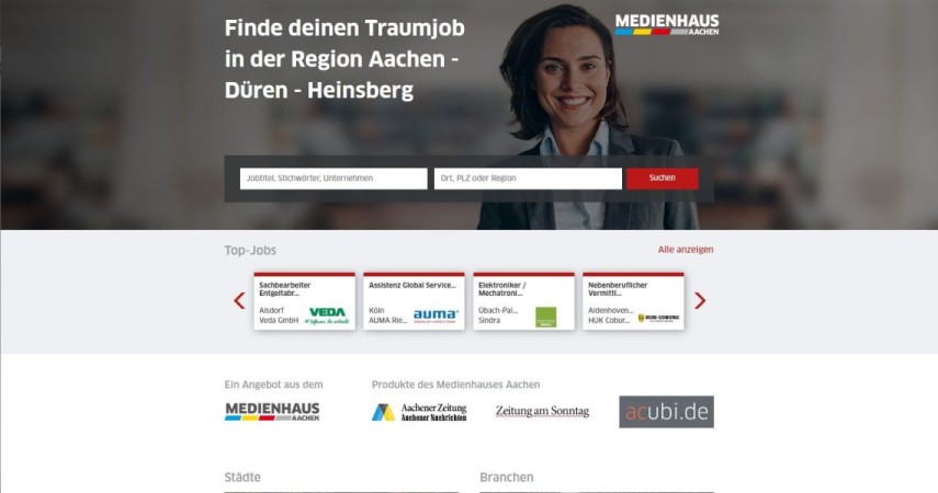 „Wir haben einen sehr guten und klaren Blick auf die Region Aachen und auf die Kreise Düren und Heinsberg“, sagt Alexandra Behle, Verlagsleiterin des Medienhauses Aachen. „Mit Aachener Zeitung, Aachener Nachrichten, ob gedruckt oder digital, mit der Zeitung am Sonntag und den vielfältigen Magazintiteln unseres Hauses begleiten wir die Region seit Jahrzehnten. Wir haben die Unternehmen vor Ort im Blick, stehen in gutem Kontakt, wir kennen den Arbeitsmarkt.“ Für das Medienhaus sei es deshalb naheliegend gewesen, ein Stellen-Portal zu starten.